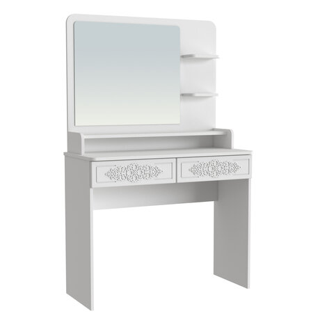 Туалетный столик ТСН-3 - неотъемлемая часть спальни или женской комнаты. Каждая девочка, девушка или дама хочет иметь собственное пространство, свой уголок красоты, для того чтобы привести себя в порядок, нанести макияж, удобно и компактно расставить свою косметику и парфюмерию, аккуратно сложить украшения и аксессуары. Столик имеет два выдвижных ящика на телескопических направляющих без доводчиков и зеркало с тремя полками. Размеры зеркала (ш/в) в мм: 630x550 мм. В оформлении фасадов МДФ применяется уникальная технология нанесения объемного узора (3D). Фурнитура: телескопические направляющие полного выдвижения без доводчиков.